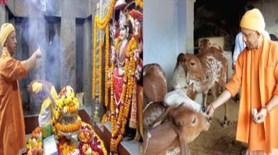 सीएम योगी ने मां पाटेश्वरी की आरती उतारी, देवीपाटन मंदिर में की गोसेवा, खिलाया गुड़-चना