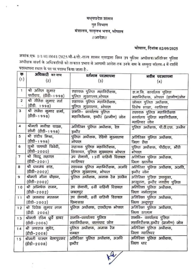 मध्य प्रदेश शासन के गृह विभाग द्वारा जारी आदेश के मुताबिक PHQ भोपाल में एआईजी अनिल कुमार पाटीदार को स.म.नि. कार्यालय पुलिस महानिरीक्षक, भोपाल (ग्रामीण) जोन, पीएचक्यू भोपाल में ही पदस्थ एआईजी गीतेश कुमार गर्ग को जोनल पुलिस अधीक्षक, विशेष शाखा, ग्वालियर, इंदौर रेल एडिशनल एसपी मनीषा पाठक को पीटीएस एसपी उज्जैन, रेडियो मुख्यालय भोपाल में एसपी संदीप मिश्रा को एडिशनल एसपी रीवा नवीन पदस्थापना दी गई है.
