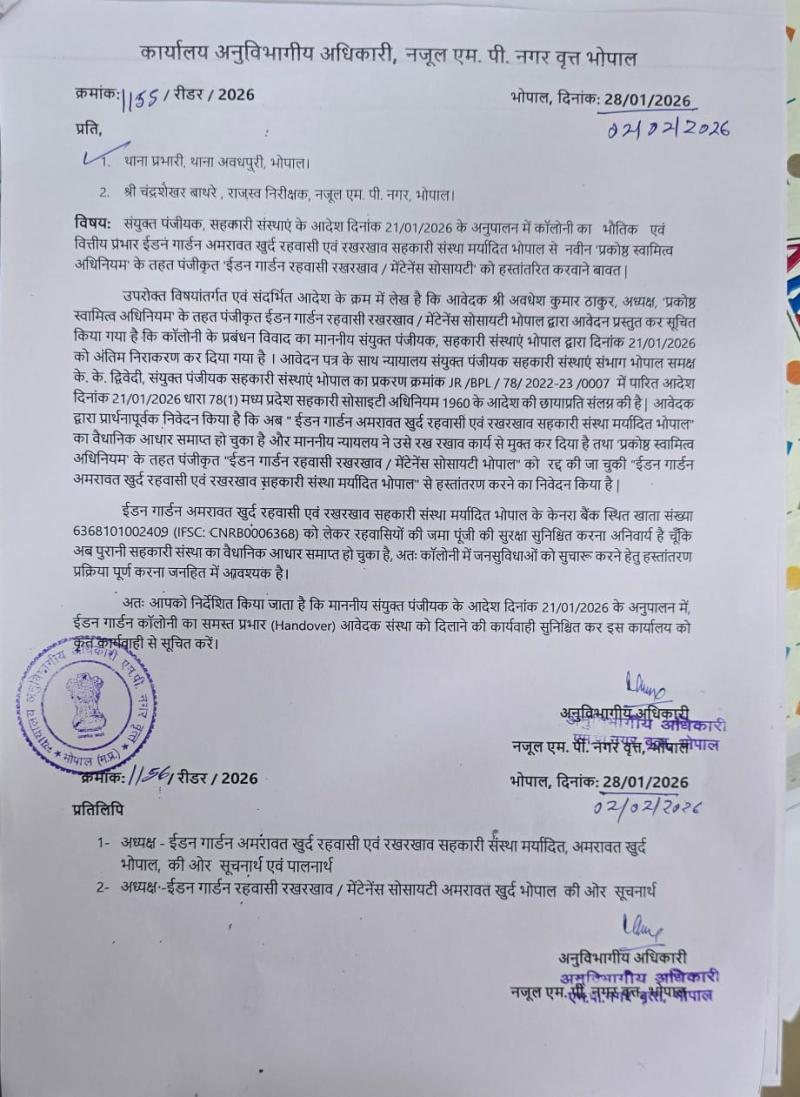 भोपाल । अमरावत खुर्द स्थित ईडन गार्डन कॉलोनी इन दिनों गंभीर प्रशासनिक विवाद का केंद्र बनी हुई है। कॉलोनी के रहवासियों का आरोप है कि वैधानिक रूप से गठित प्रबंधन संस्था को अब तक प्रभार नहीं सौंपा गया, जिससे बुनियादी विकास कार्य प्रभावित हो रहे हैं। जानकारी के अनुसार, अनुविभागीय अधिकारी (एसडीएम) एम.पी. नगर द्वारा ‘म.प्र. प्रकोष्ठ स्वामित्व अधिनियम, 2000’ के तहत कॉलोनी के रख-रखाव के लिए एक वैधानिक मेंटेनेंस संस्था का गठन किया गया। यह संस्था शासन द्वारा राजपत्र (गजट) में अधिसूचित और अधिकृत बताई जा रही है।
