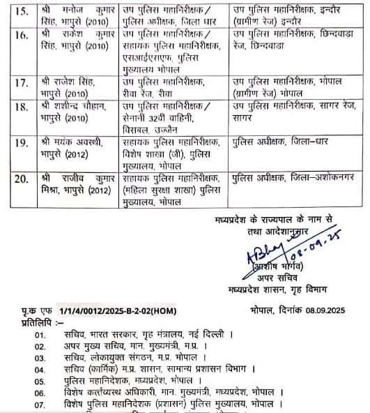 मयंक अवस्थी को धार जिले के पुलिस अधीक्षक की जिम्मेदारी दी गई है। इससे पहले वे पुलिस मुख्यालय में सहायक पुलिस महानिरीक्षक के पद पर तैनात थे। वहीं राजीव कुमार मिश्रा को पुलिस मुख्यालय (सहायक पुलिस महानिरीक्षक) के पद से स्थानांतरित करके अशोकनगर जिला पुलिस अधीक्षक बनाया गया है। राजेश सिंह भोपाल रेंज के उप पुलिस महानिरीक्षक बनाए गए हैं।