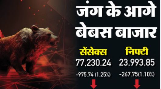 पश्चिम एशिया में जारी तनाव और विदेशी निधियों की निरंतर निकासी के बीच एक दिन की राहत के बाद बुधवार को शुरुआती कारोबार में बेंचमार्क सूचकांक सेंसेक्स और निफ्टी में गिरावट दर्ज की गई। ब्लू-चिप बैंक शेयरों में बिकवाली के कारण भी बाजार में गिरावट आई। शुरुआती कारोबार में रुपया अमेरिकी डॉलर के मुकाबले 4 पैसे गिरकर 91.89 पर आ गया। सेंसेक्स 11:50 तक 975.74 अंक या 1.25% टूटकर 77,230.24 अंक पर आ गया। वहीं निफ्टी 267.75 अंक या 1.10% गिरकर 23,993.85 अंक पर आ गया।शुरुआती कारोबार में 30 शेयरों वाला बीएसई सेंसेक्स 96.12 अंक गिरकर 78,109.86 पर आ गया। वहीं, 50 शेयरों वाला एनएसई निफ्टी 22.95 अंक गिरकर 24,238.65 पर पहुंच गया।